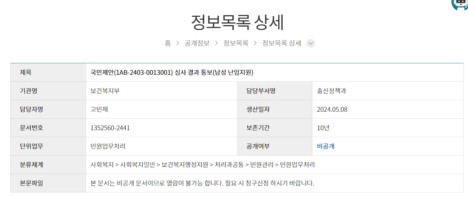 (출산정책과-2441) '국민제안(1AB-2403-0013001) 심사 결과 통보(남성 난임지원)' 문서를 정보공개 청구합니다.