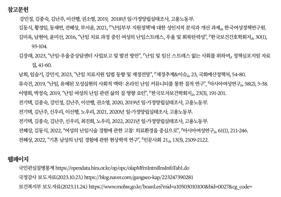 서한기, 2023, “난임 부부, 내년부터 소득무관 전국 어디서나 시술비 지원받는다”, 『연합뉴스』, 2023. 10. 16.