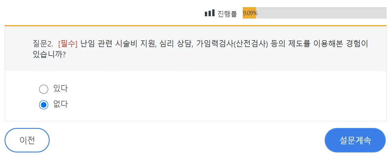 질문2.[필수] 난임 관련 시술비 지원, 심리 상담, 가임력검사(산전검사) 등의 제도를 이용해본 경험이 있습니까?