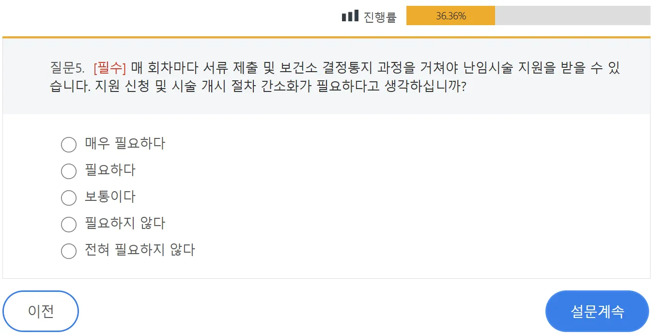 질문5.[필수] 매 회차마다 서류 제출 및 보건소 결정통지 과정을 거쳐야 난임시술 지원을 받을 수 있습니다. 지원 신청 및 시술 개시 절차 간소화가 필요하다고 생각하십니까?