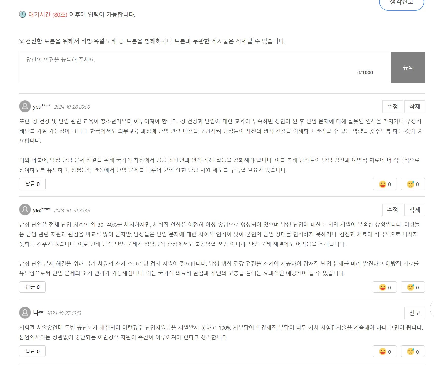 : 난임 지원 정책이 여성뿐 아니라 남성에게도 실질적인 혜택을 줄 수 있도록 설계해야 합니다. 예를 들어, 난임 진단비와 치료비에 대한 지원을 남성에게도 확대하고, 기업 내 남성 난임 휴가 및 복지 프로그램을 강화하도록 독려하는 방안을 고려할 수 있습니다.