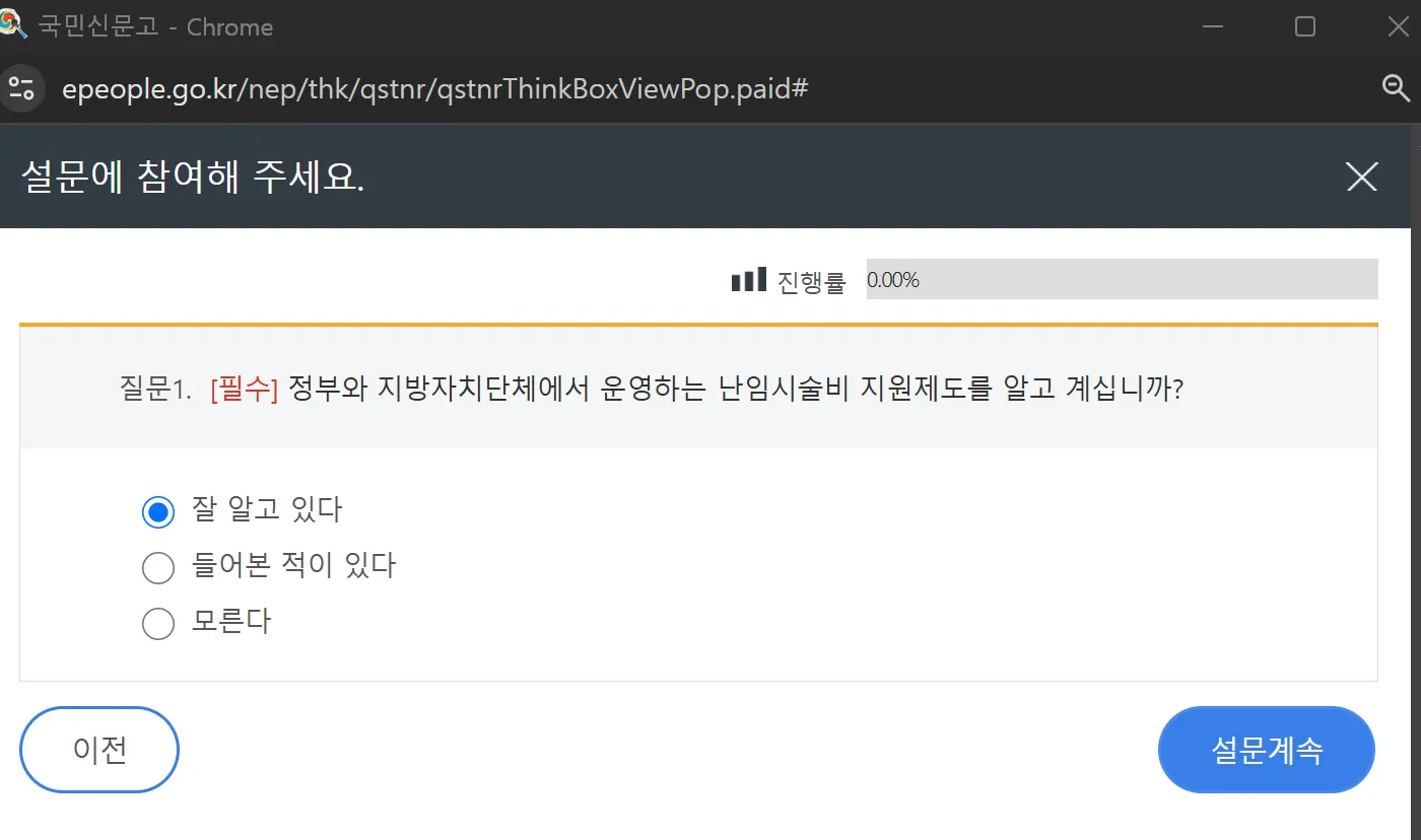 질문1.[필수] 정부와 지방자치단체에서 운영하는 난임시술비 지원제도를 알고 계십니까?