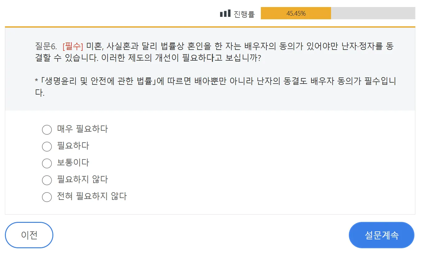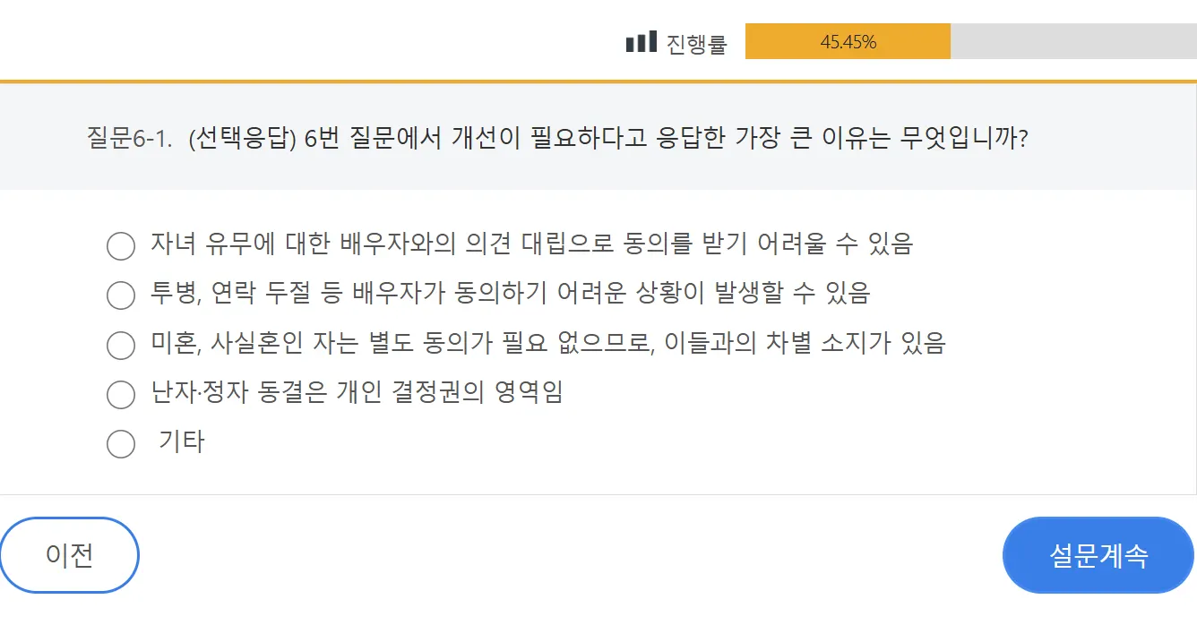 질문6.[필수] 미혼, 사실혼과 달리 법률상 혼인을 한 자는 배우자의 동의가 있어야만 난자·정자를 동결할 수 있습니다. 이러한 제도의 개선이 필요하다고 보십니까?「생명윤리 및 안전에 관한 법률」에 따르면 배아뿐만 아니라 난자의 동결도 배우자 동의가 필수입니다.