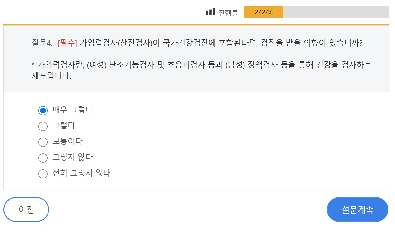 질문4.[필수] 가임력검사(산전검사)이 국가건강검진에 포함된다면, 검진을 받을 의향이 있습니까?가임력검사란, (여성) 난소기능검사 및 초음파검사 등과 (남성) 정액검사 등을 통해 건강을 검사하는 제도입니다.