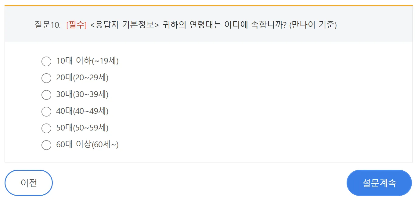 질문10.[필수] <응답자 기본정보> 귀하의 연령대는 어디에 속합니까? (만나이 기준)