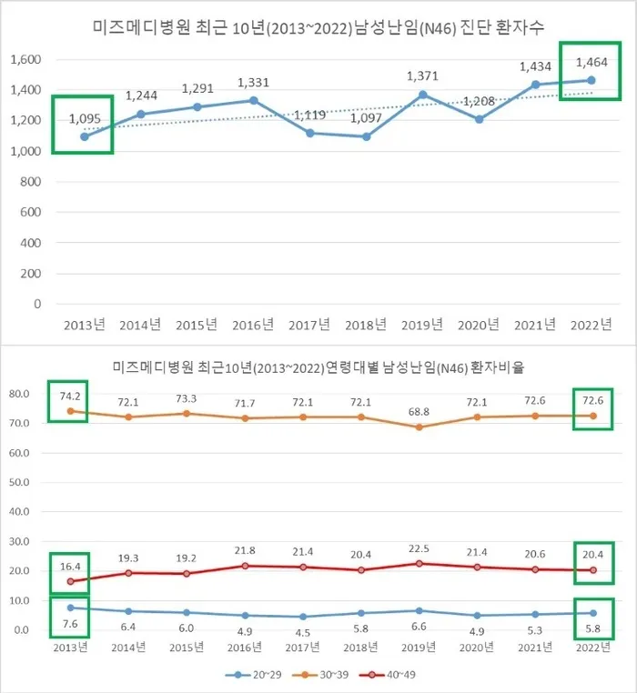 남성 난임 환자가 10년 동안 33.7% 증가했으며, 특히 40대 환자의 비율이 높아지고 있습니다. 주된 원인은 정자 형성 장애, 정자 이동 장애, 성기능 장애 등입니다. 생활습관 개선과 조기 진단을 통해 정자의 질을 향상시키는 것이 중요합니다. 미즈메디병원은 맞춤형 난임 치료를 제공하며, 고환 조직 냉동보관은행 등을 운영해 남성 가임력을 확인하고 치료합니다.